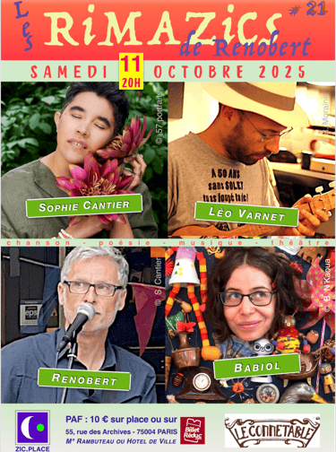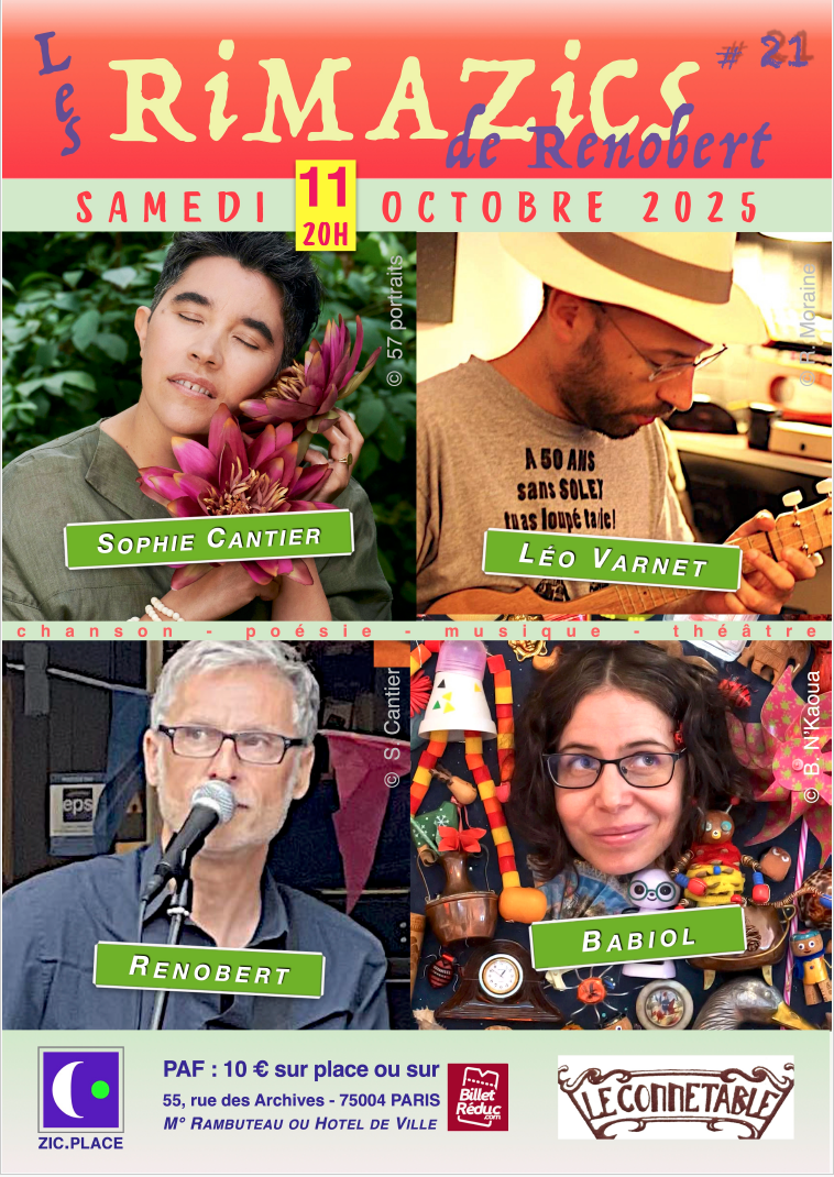 A l’invitation de RENOBERT, et grâce à l’engagement et soutien d’artistes émérites, les rendez-vous RiMAZiC (chanson, musique, poésie, théâtre...) font la part belle à la création francophone, sans exclusivité. Co-plateau, talents, invités surprise... à écouter et à voir ! Programme : Léo VARNET, BABIOL, Sophie CANTIER, RENOBERT. LE CONNETABLE - 55, rue des Archives - 75004 Paris – M° Rambuteau ou Hotel de ville / Entrée 10 €